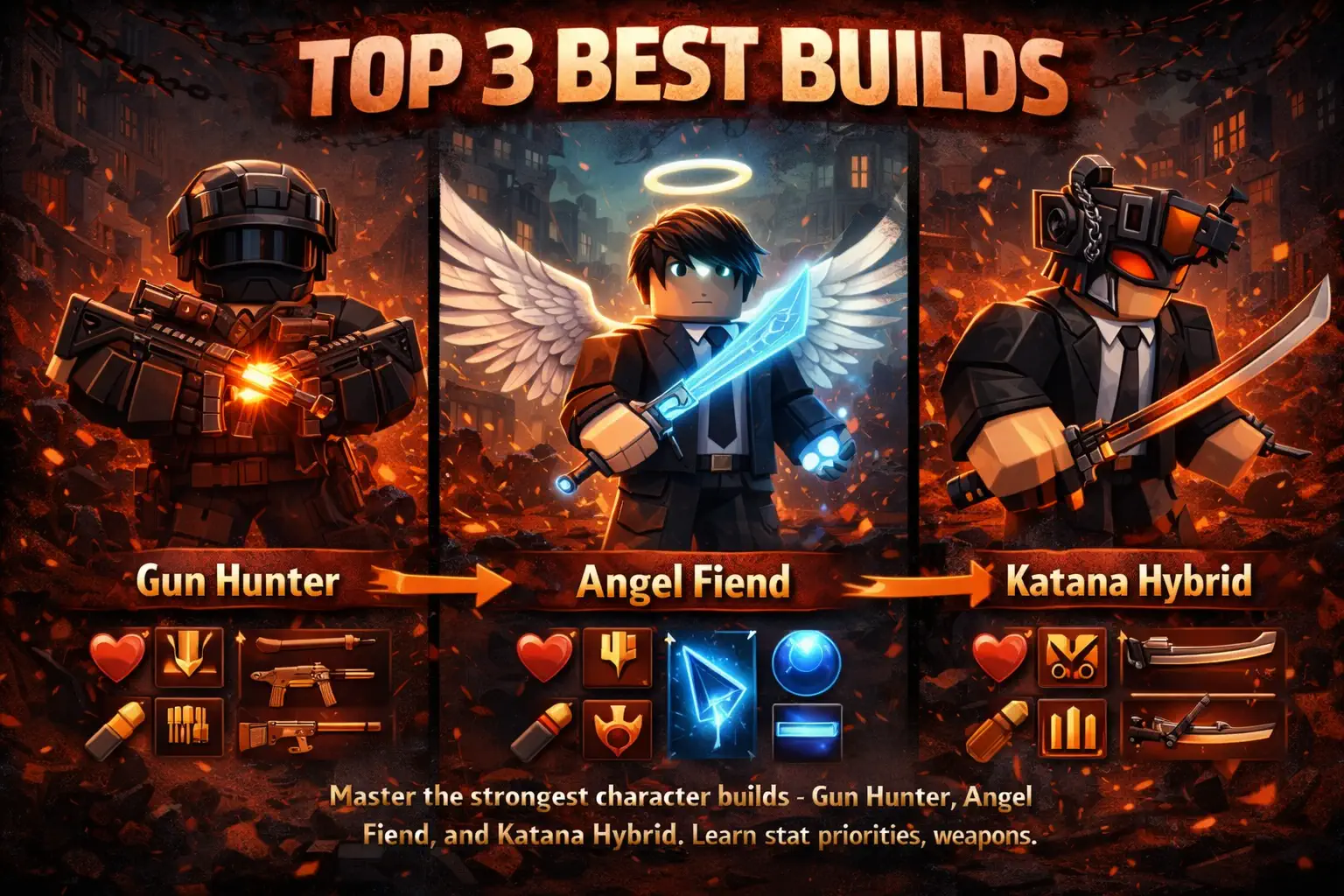 Master the strongest builds in Devil Hunter - Gun Hunter, Angel Fiend, and Katana Hybrid. Learn weapon selection, stat priorities, and combat strategies.
